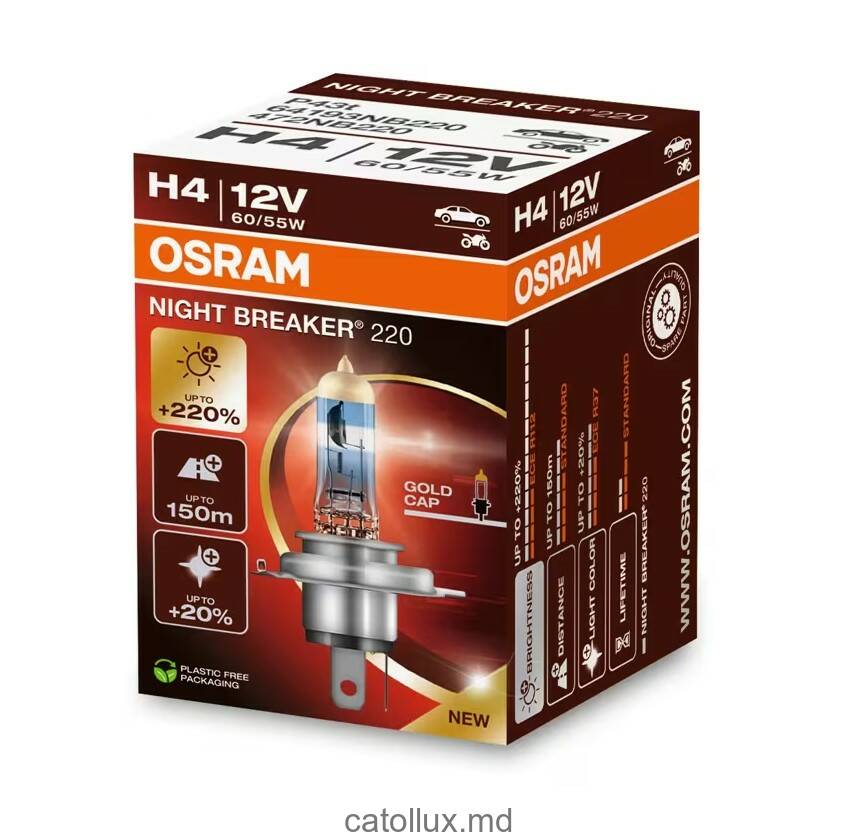Treceți la un nou nivel de iluminare cu NIGHT BREAKER 220 – cea mai luminoasă lampă halogen pentru automobile de la OSRAM! Aceste becuri avansate pentru faruri oferă cu până la 220% mai multă luminozitate și cu până la 20% mai multă lumină albă în comparație cu cerințele minime, creând un fascicul luminos cu o lungime de până la 150 m. Mai multă lumină și o vizibilitate îmbunătățită îi ajută pe șoferi să identifice mai rapid pericolele de pe șosea și să reacționeze la ele. O alegere ideală pentru cei care apreciază iluminarea auto puternică și clară.