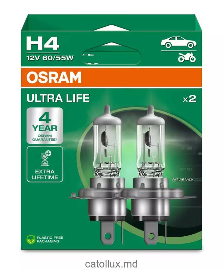 Автомобильные лампы OSRAM ULTRA LIFE пользуются популярностью благодаря своей долговечности. Они имеют впечатляющий срок службы — до четырёх раз дольше по сравнению со стандартными галогенными лампами и могут работать до 100 000 км (при среднем годовом пробеге 14 259 км и 60% включенного света). Кроме того, лампы ULTRA LIFE имеют современный дизайн с серебристым колпачком (H4/H7/H11). Они идеально подходят для часто ездящих водителей или для тех, кто использует дневные ходовые огни, а также могут использоваться в фарах с прозрачным стеклом.
